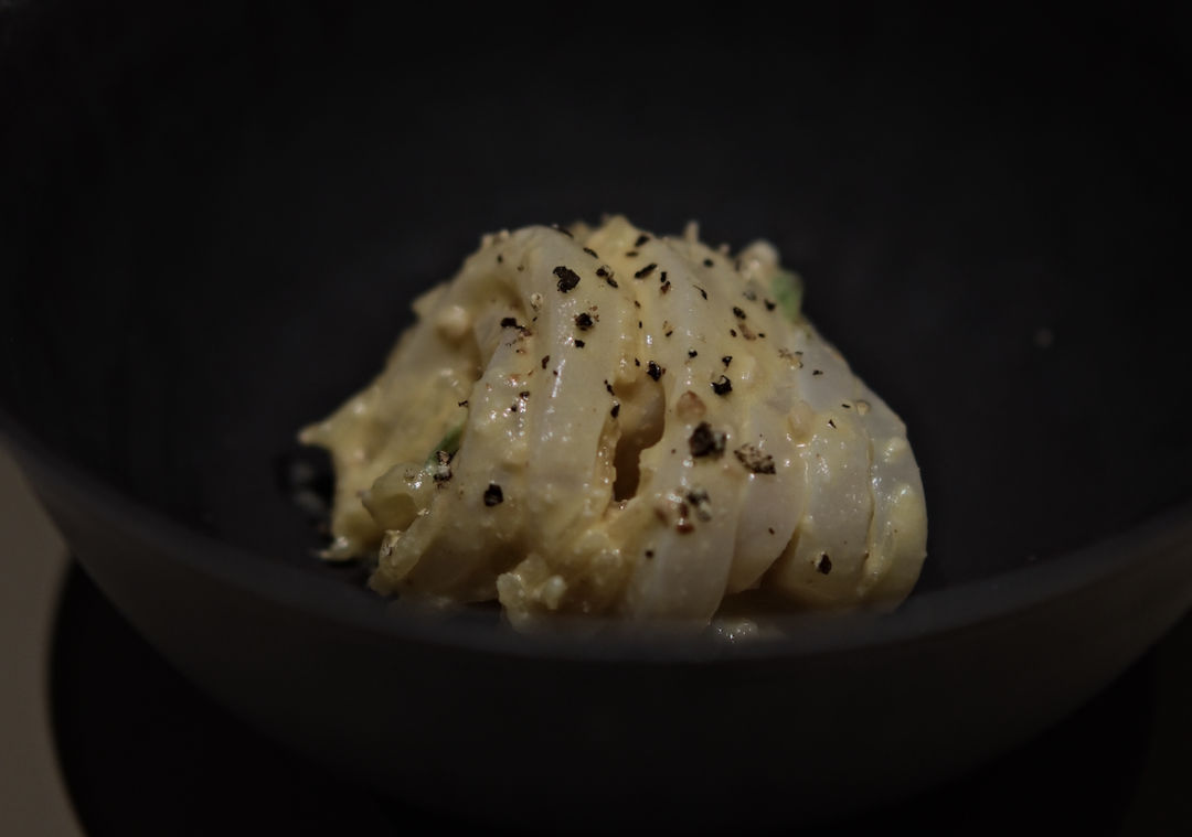 The menu of that day started with spear squid “pasta” intertwined with strands of pumpkin somen, coated by emulsified sauce of passion fruit that resembled a carbonara. The natural sweetness of the squid melded perfectly with the tropical tang of the fruit, and the lively fragrance of pepper added a playful accent.