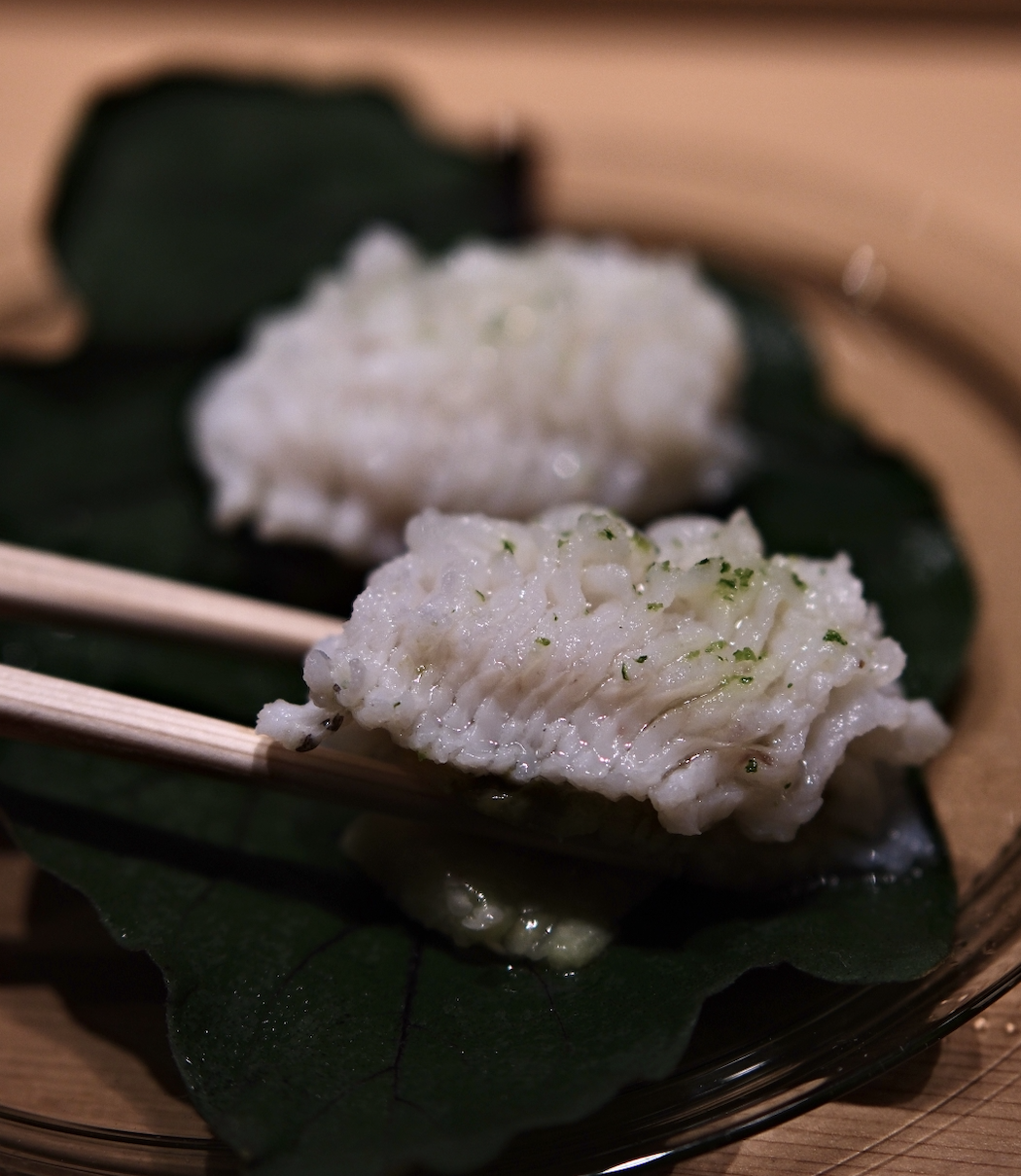 Still savoring the bōzushi, I suddenly heard the rhythmic sound of a knife at work. Looking up, it was Chef Ugo expertly handling a hamo (pike conger)—a prized summer fish in Japan—performing the honegiri (bone-cutting) technique with precision. Traditionally, it takes years of training at a traditional Japanese restaurant to master this. Yet here was this young French chef, confident and poised, slicing like a Kyoto veteran—and indeed, he once trained at the three-star kaiseki restaurant Kikunoi Honten.