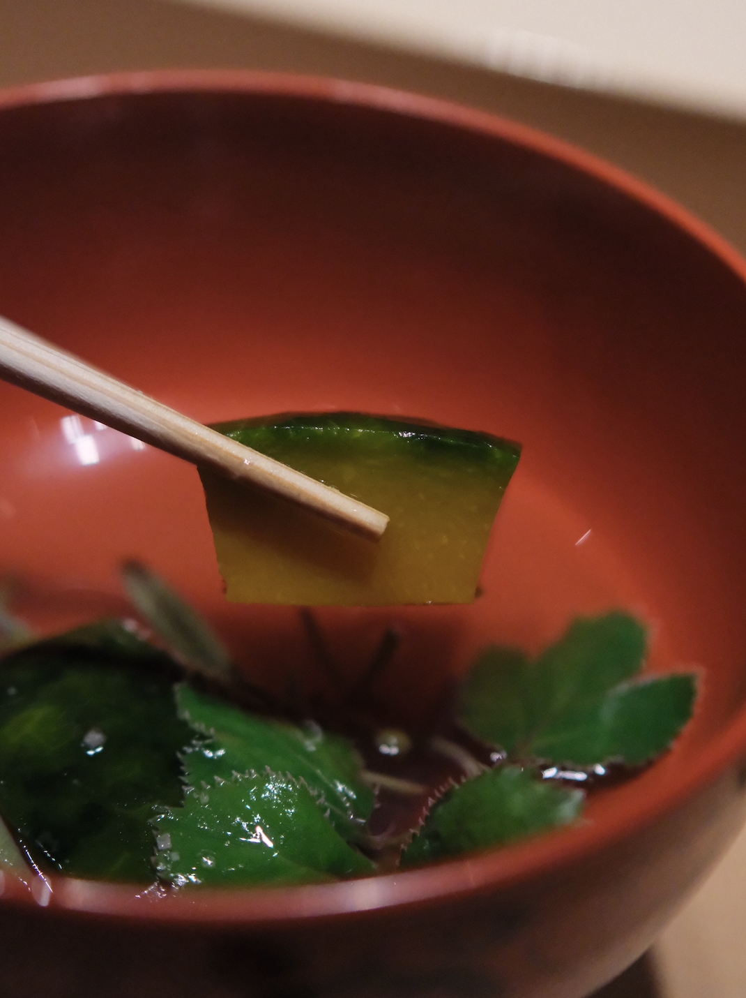 Have you had a cold wanmono before? In order to evoke the refreshing coolness of summer, Ugo created a version without the use of traditional dashi ingredients like kelp or bonito flakes. Instead, he drew out umami purely from vegetables. The star was starchy dark-skinned pumpkin from Chiba with remarkable sweetness. After salting and steaming, the pumpkin was peeled and deseeded, where the skin and seeds were used to make a clear broth together with some herbs. Finished only with traditional Japanese seasonings and topped with jun-sai (water shield) from Akita, the soup was pristine and soothing.