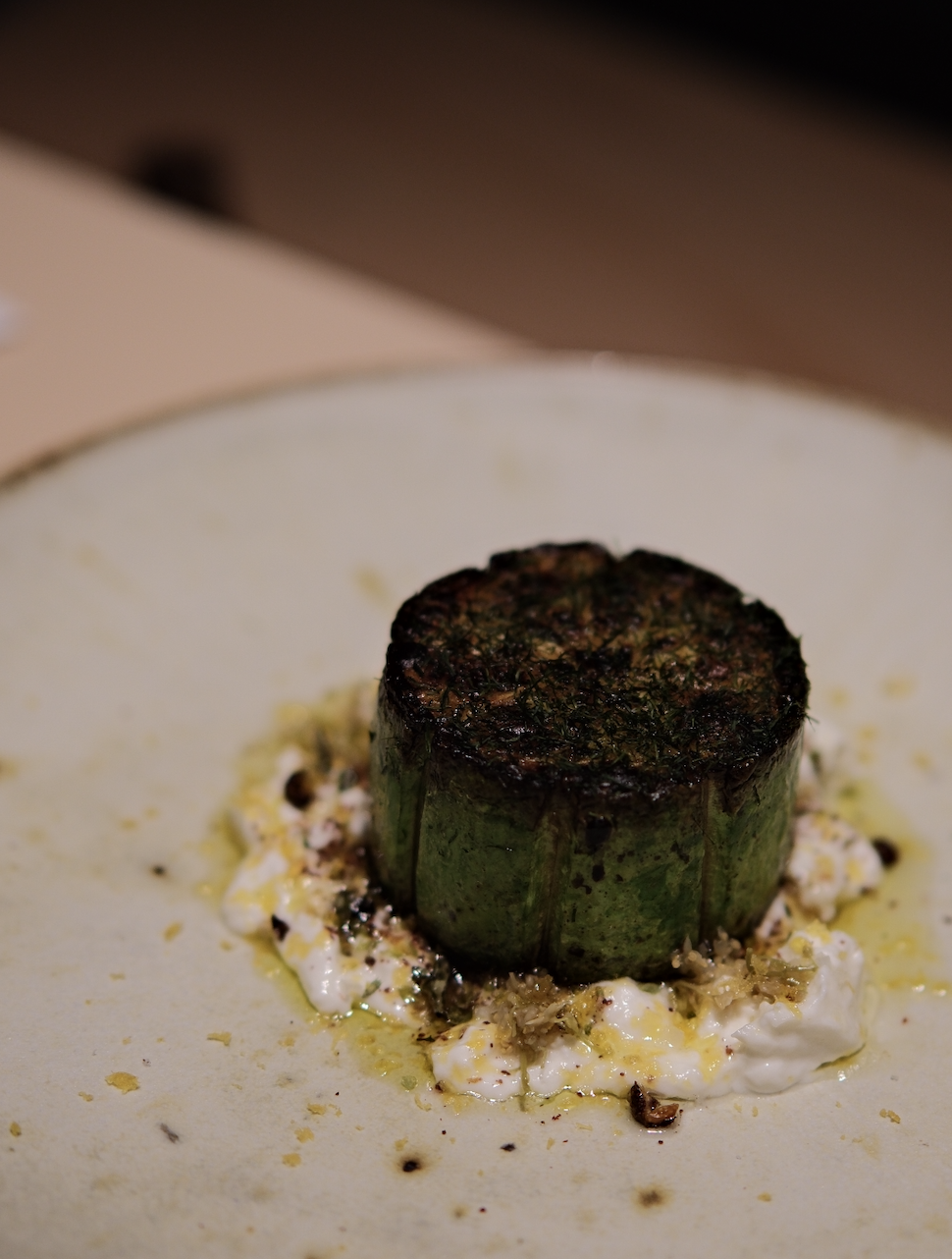 The following zucchini dish carried a Middle Eastern twist. Beautifully caramelized on the outside yet juicy inside, it was seasoned with za'atar, the spice blend centered on sumac, and paired with burrata cheese, house-made karasumi, and seaweed powder. The harmony of za’atar’s aromatic tang, olive oil’s fruitiness, and burrata’s milky richness created a sauce that is complex yet beautifully balanced.