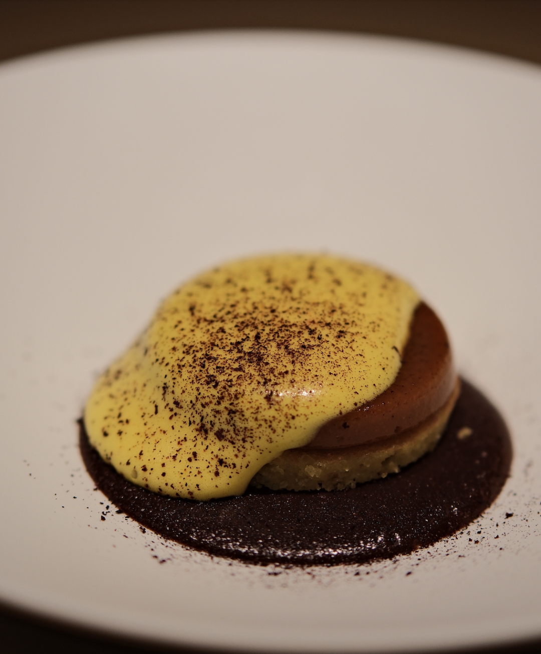 But the dish exceeded every expectation. A warm chocolate ganache topped with hazelnut sponge cake soaked in saffron syrup, a paprika and shiso sorbet, and a saffron sabayon accented with white miso and elderflower vinegar. The Colombian chocolate carried both floral and nutty notes, harmonizing beautifully with rest of the elements, while the airy sabayon tied everything together. Warm and cold, sweet and tart, savory and bitter—all blending seamlessly in one astonishing mouthful.