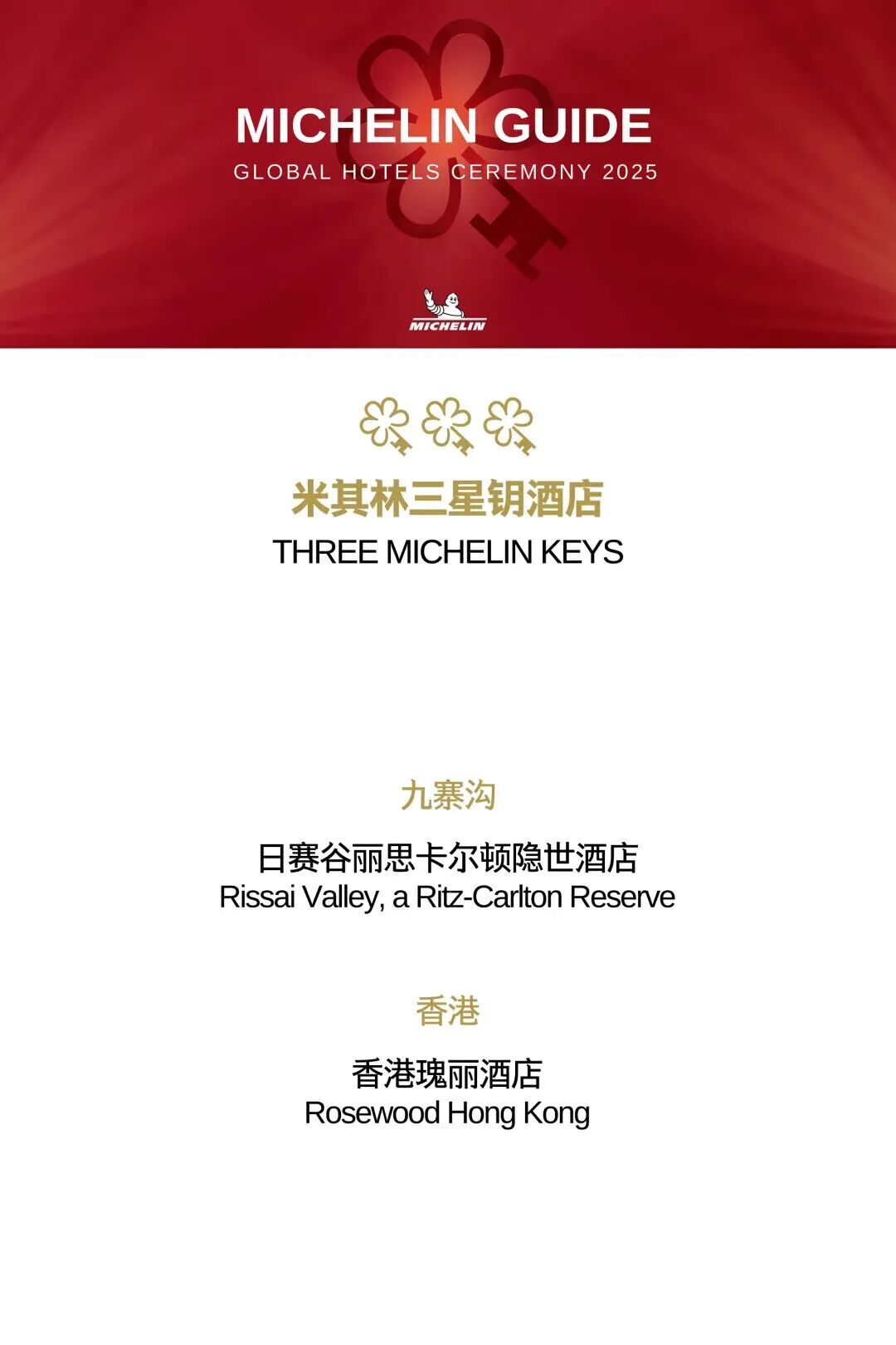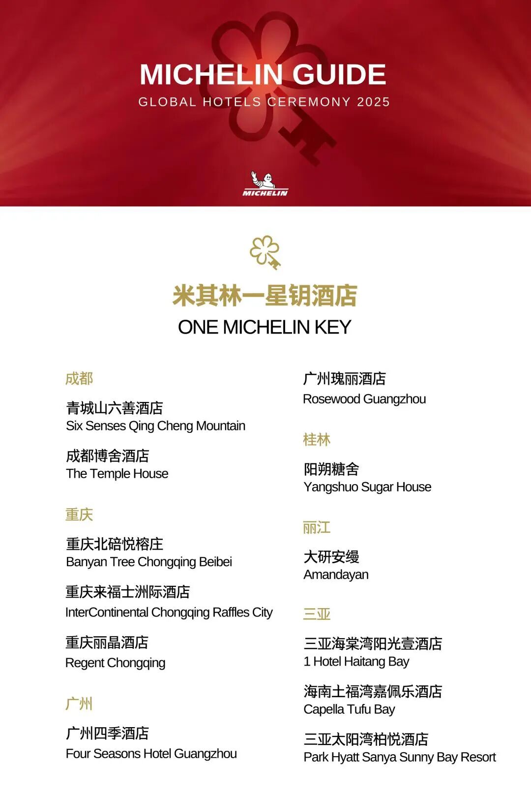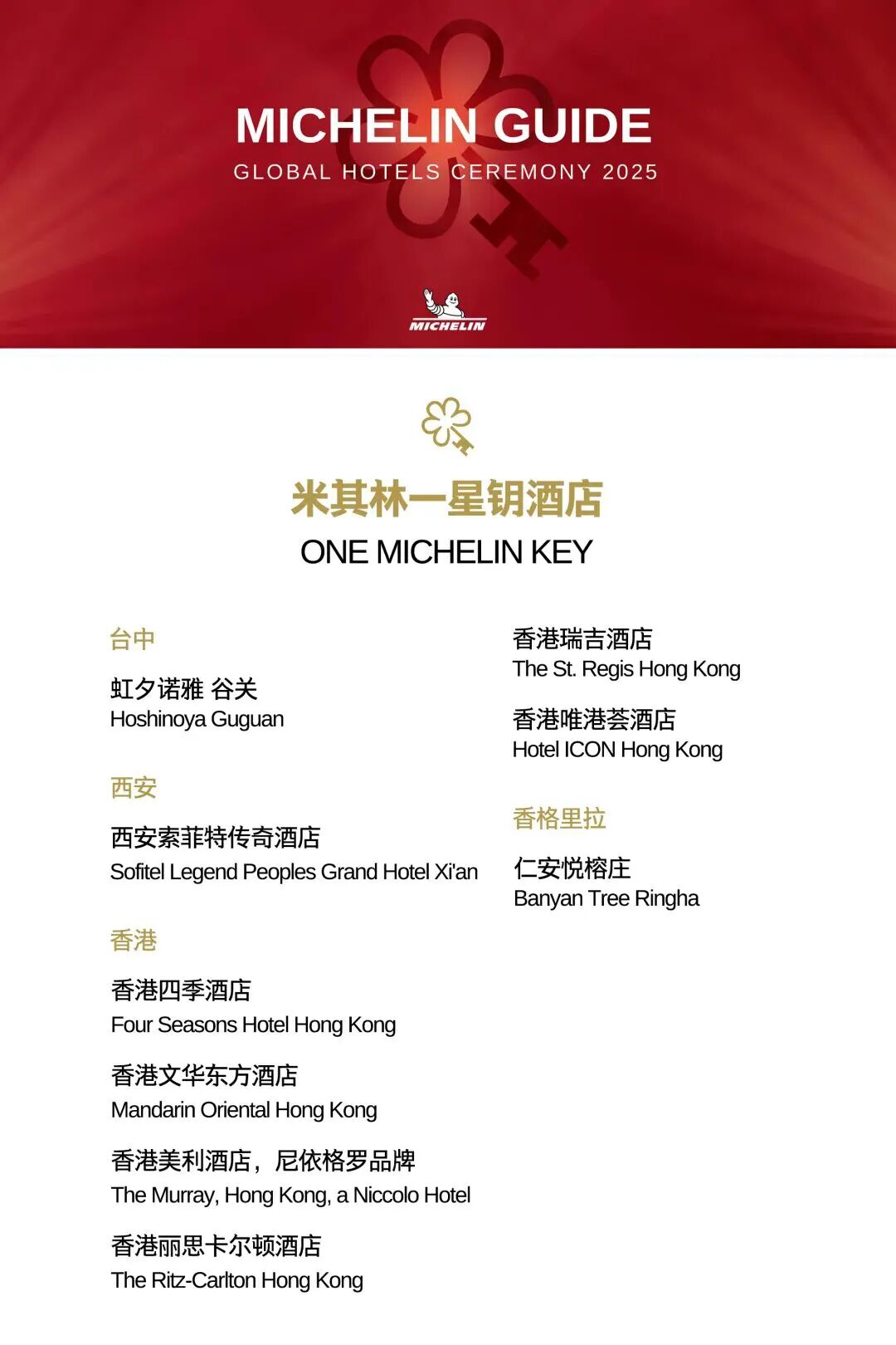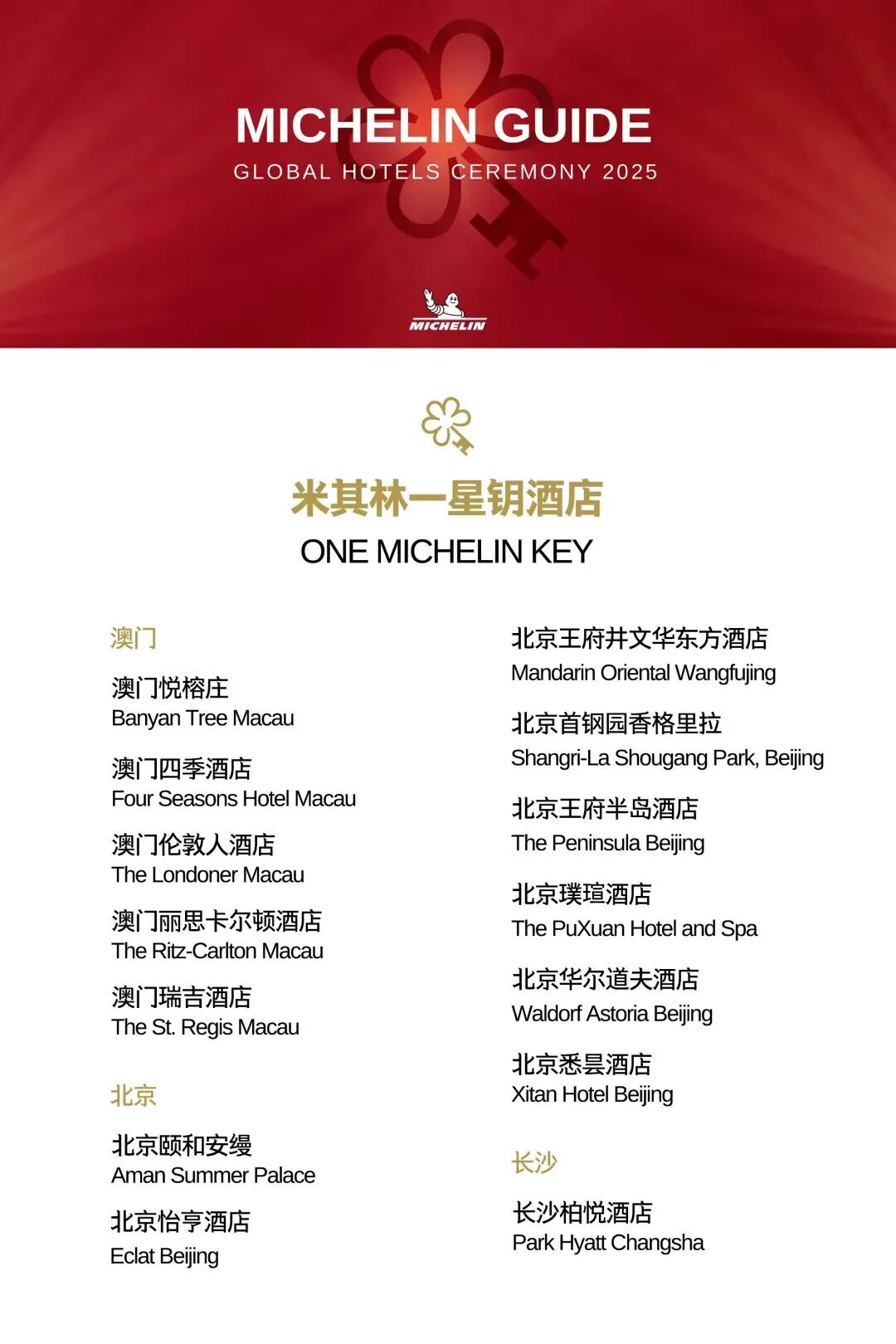 2025 年 10 月 8 日,米其林酒店星鑰榜單(MICHELIN Keys)公佈。本次酒店指南的評選範圍涵蓋全球五大洲,同時首次將評選範圍擴展至全球近100個新國家。目前全球共有143家三星鑰酒店、572家二星鑰酒店與1742家一星鑰酒店入選。今年,中國首次被納入評選範圍,中國大陸共有42家酒店獲得星鑰殊榮,香港地區9家、澳門地區9家、台灣地區4家,其中包括2家三星鑰酒店、13家二星鑰酒店與49家一星鑰酒店。