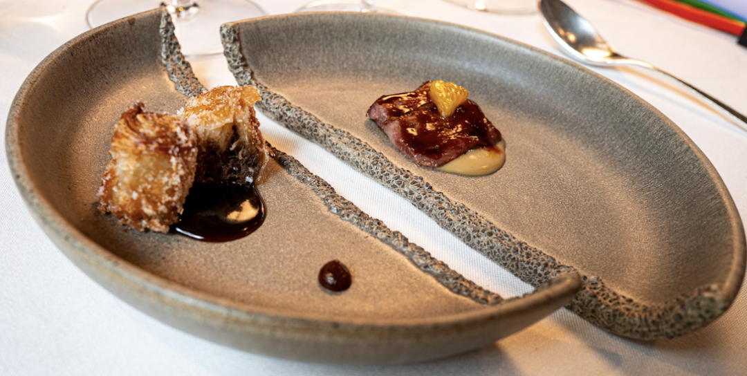 可食用橄欖別在小盆景上,經典依舊,香氣與質地完美。雪莉酒蒸龍蝦配杏仁泡沫與香草油細膩優雅,龍蝦介於彈牙與柔軟之間。鱈魚下巴(kokotxas)——向巴斯克傳統致敬,用蔥與橙香重新詮釋。鴨肉與血橙咸版xuixo懷舊又顛覆,把甜點轉成主菜的戲劇性收尾。整個菜單細膩中帶著力量,味覺沒有一秒是空白的,菜單宏大,但不拖泥帶水。
