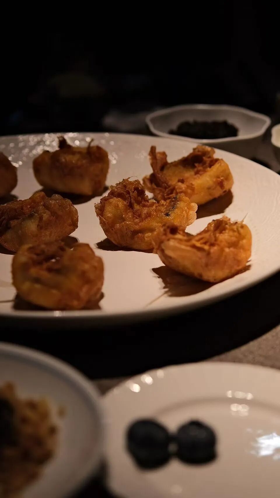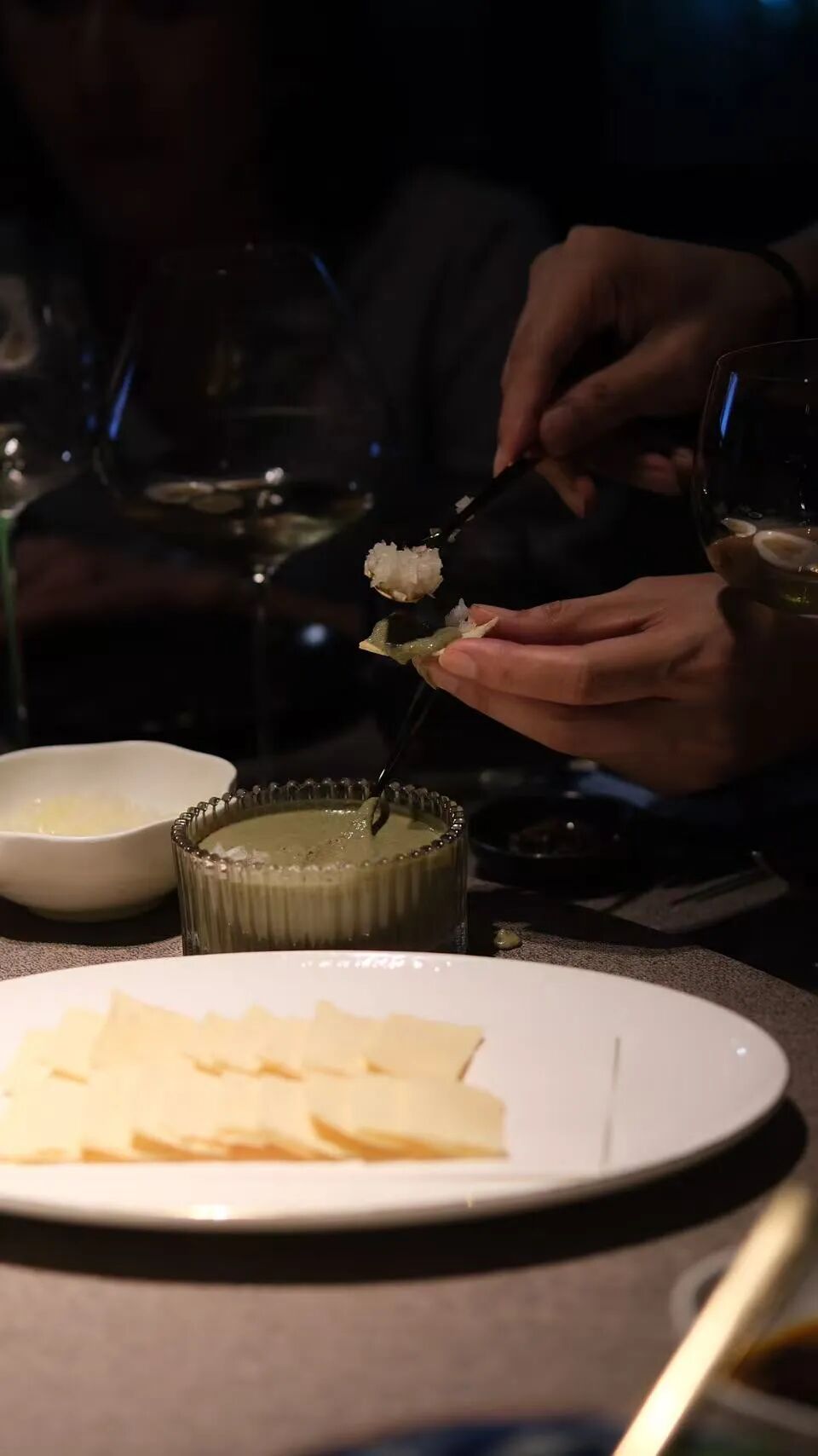 當天開場使用傳統的石磨研磨的手工豆腐,搭配了一人一份的蘸水,裡面用雲南的木姜子和油雞樅菌。姜香和辣味又帶著一些南洋風味,與豆腐相得益彰。挑選最好的食材,展現食材的最佳化。