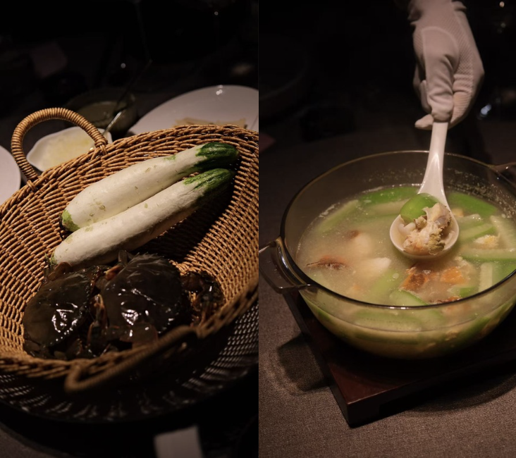 白絲瓜燒軟殼蟹湯上桌前,食材放在竹簍里展示出來,大只軟殼蟹閃著青銅色光澤,處理得十分乾淨,旁邊的絲瓜通體玉白,是浙江沿海特有的品種。再次端回餐桌,就變成了清亮的絲瓜湯,薄皮厚肉的絲瓜吸飽了湯汁,包裹在軟殼下的蟹肉飽滿鮮嫩,輕輕一抿便迸發出鮮香,喝下一碗,嘴裡滿是鮮甜。