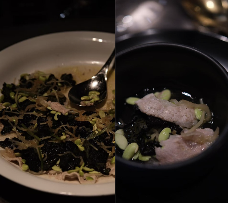 雪花肉毛豆蒸野生石耳,“雪花肉”是一只猪身上仅有两三斤的小部位,比松板肉要更细致。北平哥发现它油脂细腻、纹理如雪,于是特地剥离出来。石耳生长在深山岩壁,有奇香。只在空气纯净、水质优良的环境中存活,也难以人工培育。新鲜毛豆清甜爽口、肉片柔韧弹牙和野生石耳带来的轻微木香巧妙融合,低调却有异香。