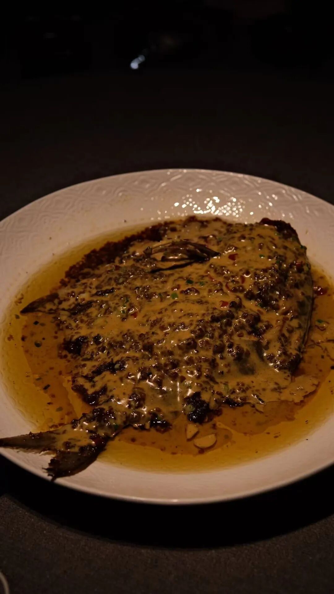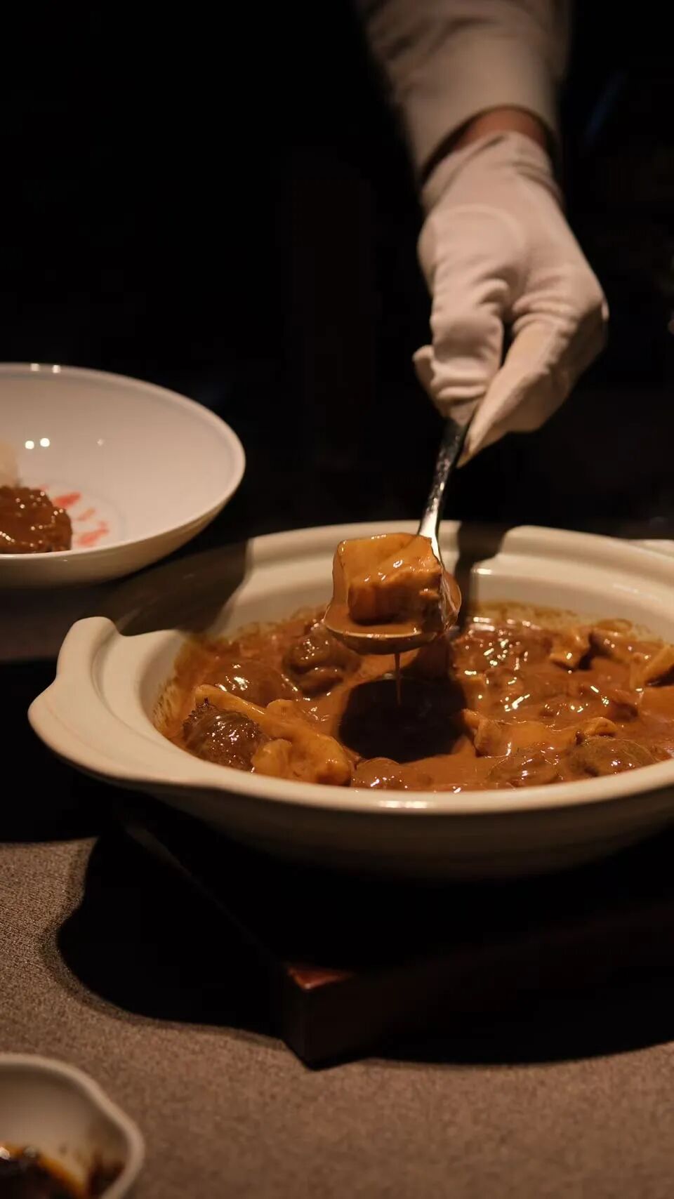 鯧魚向來生長緩慢、產量稀少,也極易受季節和潮汐影響。能夠在餐桌上見到這樣體型碩大、體態均勻的鯧魚,本身就是一種幸運。乾燒的做法原本出自川渝,後經寧波廚師引入上海,用本地味道重新詮釋,形成了乾燒鯧魚,是川揚合流的體現。北平哥突發奇想,將黃油與咖喱糅合,加入了椰漿調味。明黃色的醬汁香辣濃郁,細密地平鋪在上,牢牢包裹住纖細的魚肉,是南洋風味和川味的強強聯合。與講究的礦泉水米飯搭配,此時無聲勝有聲。