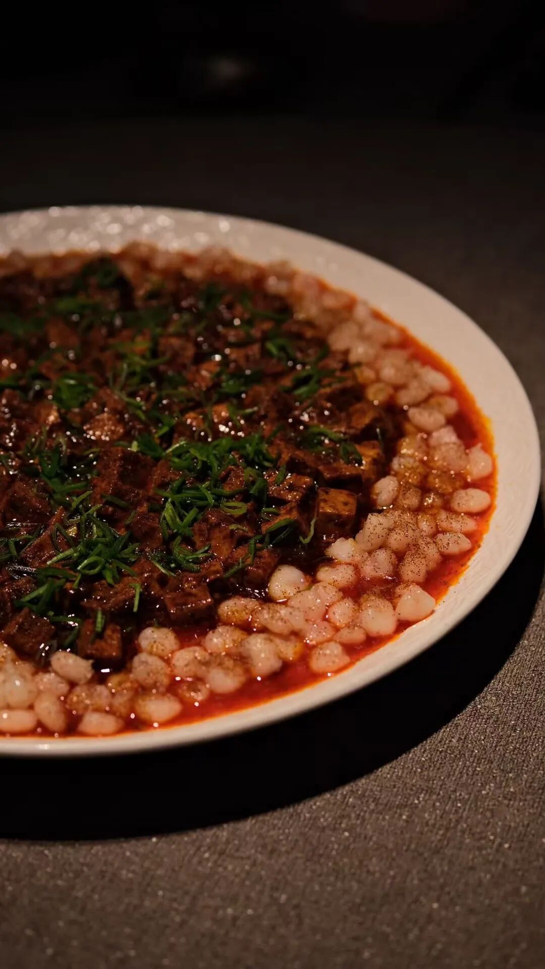 在眾人以為到此為止,端出火紅的三蝦麻婆豆腐燉蛋是最後的鮮味爆擊,腦細胞停頓。當天由台州運來上海的鹵水豆腐,承接豐富的鮮味。蝦頭與蝦膏慢火熬制,融化出的蝦油調入雞蛋液中,蒸出的蛋羹滑嫩,每一口都帶著蝦油甘香,以及慷慨份量的蝦子,事前炒出香氣——「三蝦」就此匯集。從上往下挖一口,先感受蝦的鮮甜彈牙與豆腐香辣微麻,與蛋羹融合,辣麻後回甘,口感豐富多層次。