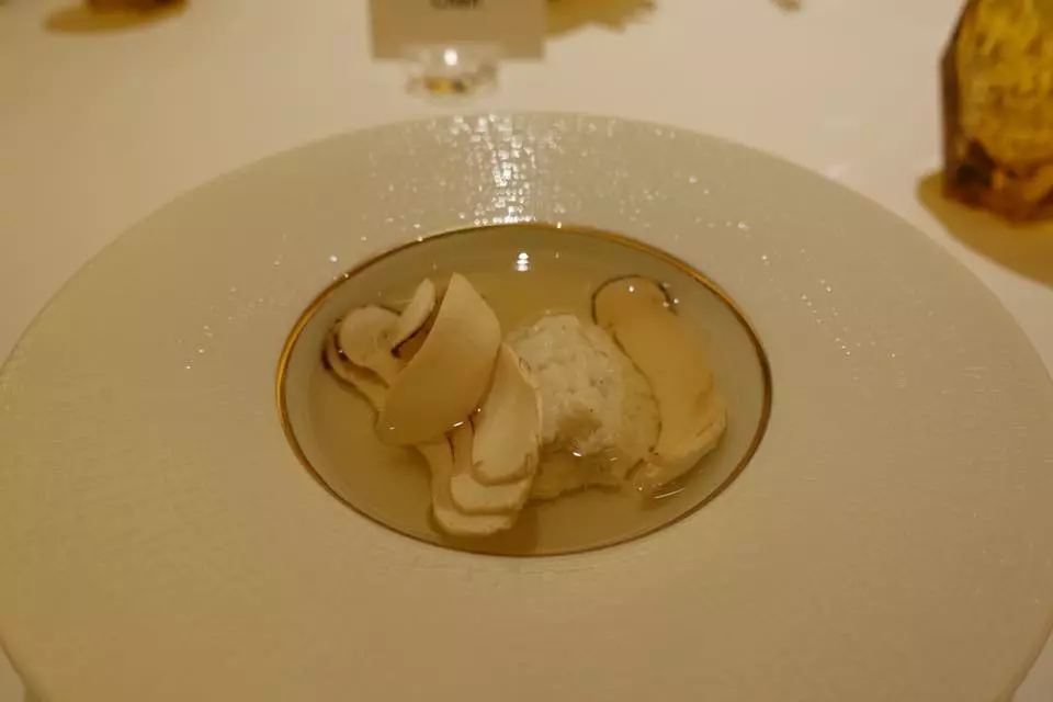 面對川菜料理的極品清湯,廊橋團隊將看似淡如水的清雞湯加上松茸與細緻的豆腐花,讓整體層次口感更上一層樓,那雞湯清澈得不見一滴油與雜質,味道卻相當濃郁,有法式清湯的風味,這道菜獲得在場人一致好評。