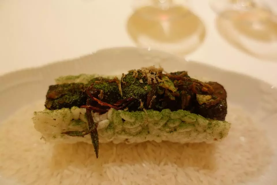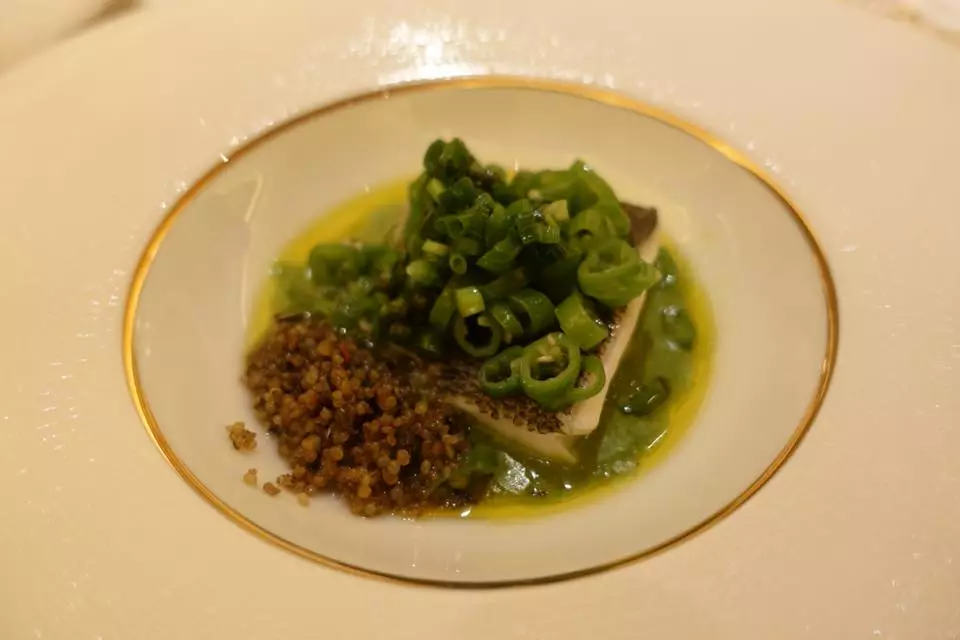主菜的部分「松露和牛田樂燒」是以鍋巴為底,和牛口味偏甜非常討喜,這道菜的巧思讓我聯想到 RAW 的牛舌餅,也是在酥脆的主食上放上牛肉。另外一道主菜筍殼魚上面是綠辣椒,旁邊擺上藜麥,魚肉蒸的恰到好處非常細嫩,撥開綠辣椒之後食用,綠辣椒香氣四溢,旁邊的藜麥也吸取了鮮美的湯汁,是一道能夠保留食材原味又極具巧思的菜色,也是讓我感到很驚艷的一道菜。同場將近 30 位媒體,團隊卻可以將筍殼魚處理得恰到好處。