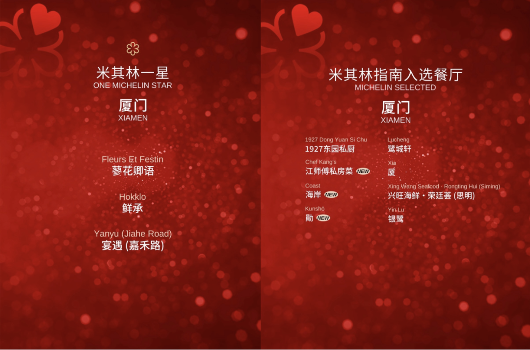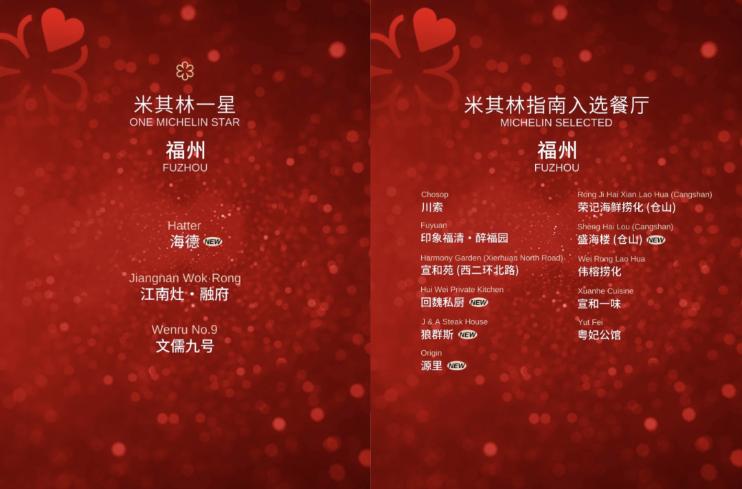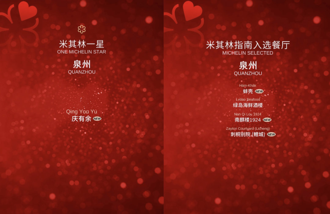 2家新晉一星餐廳中,1家位於福州(海德);1家位於泉州,也是該地首家米其林一星餐廳(慶有餘);福州的海德主打法式料理,融合了在地食材及風味;泉州的慶有餘餐廳則主打福建菜,選用海鮮食材,以閩菜古法和創新技藝呈現八閩風味。