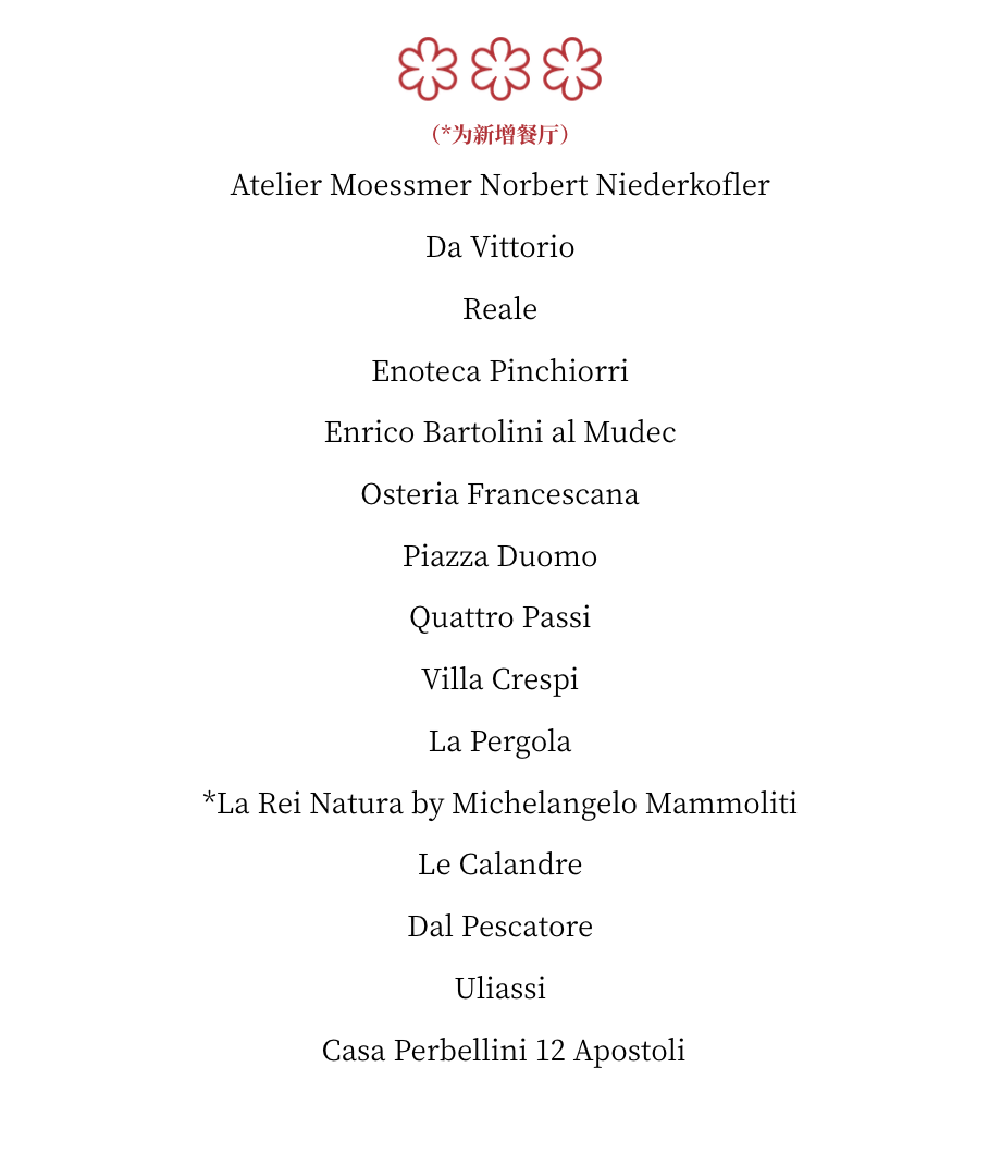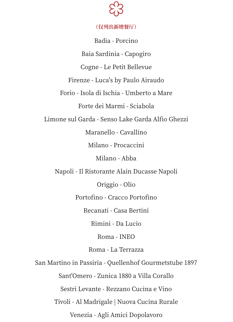 完整意大利米其林餐廳名單可參考米其林指南官網。