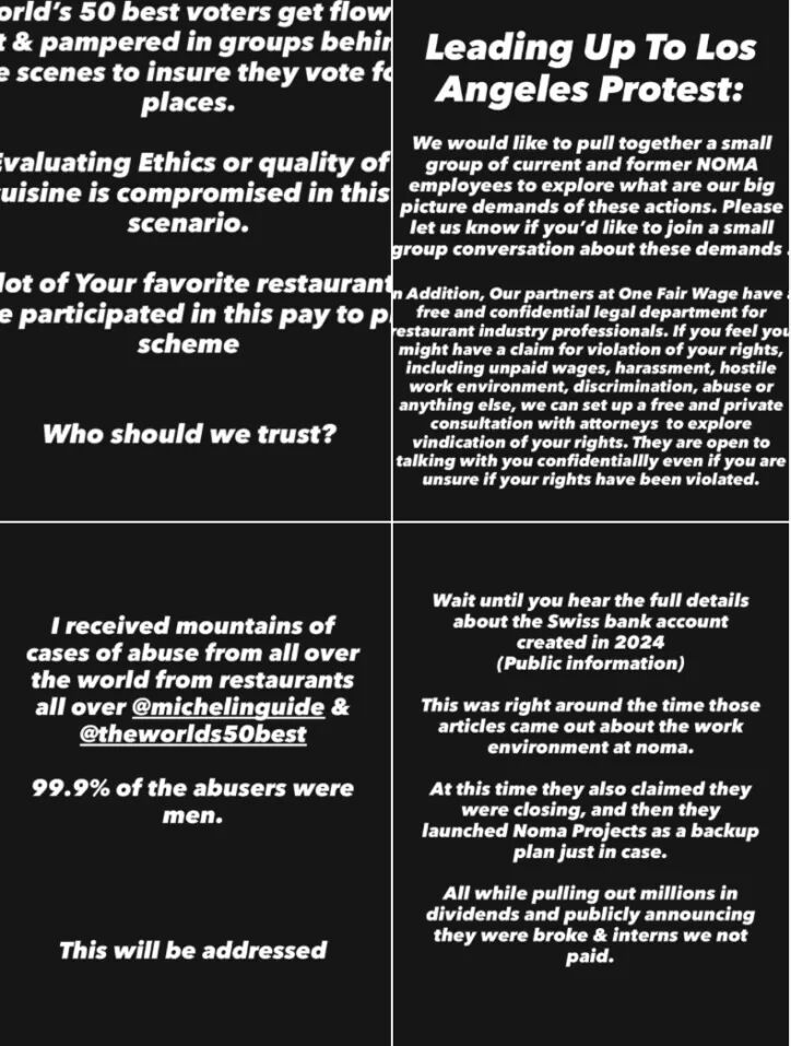 如今,當一間具有高度象徵意義的餐廳陷入暴力與職場虐待指控時,議題便不再只是單一餐廳的內部爭議,而成為對整個fine dining模式的公共討論。 Jason Ignacio White日前也宣佈,將前往洛杉磯noma快閃現場和平示威。目前noma尚未發表任何回應。