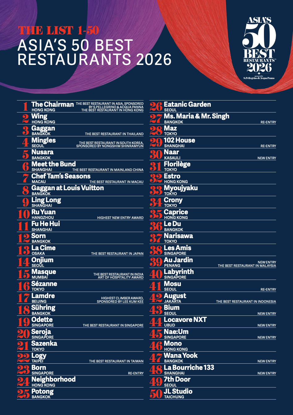 前五十完整榜單如下,詳情可參考亞洲五十最佳餐廳官網。